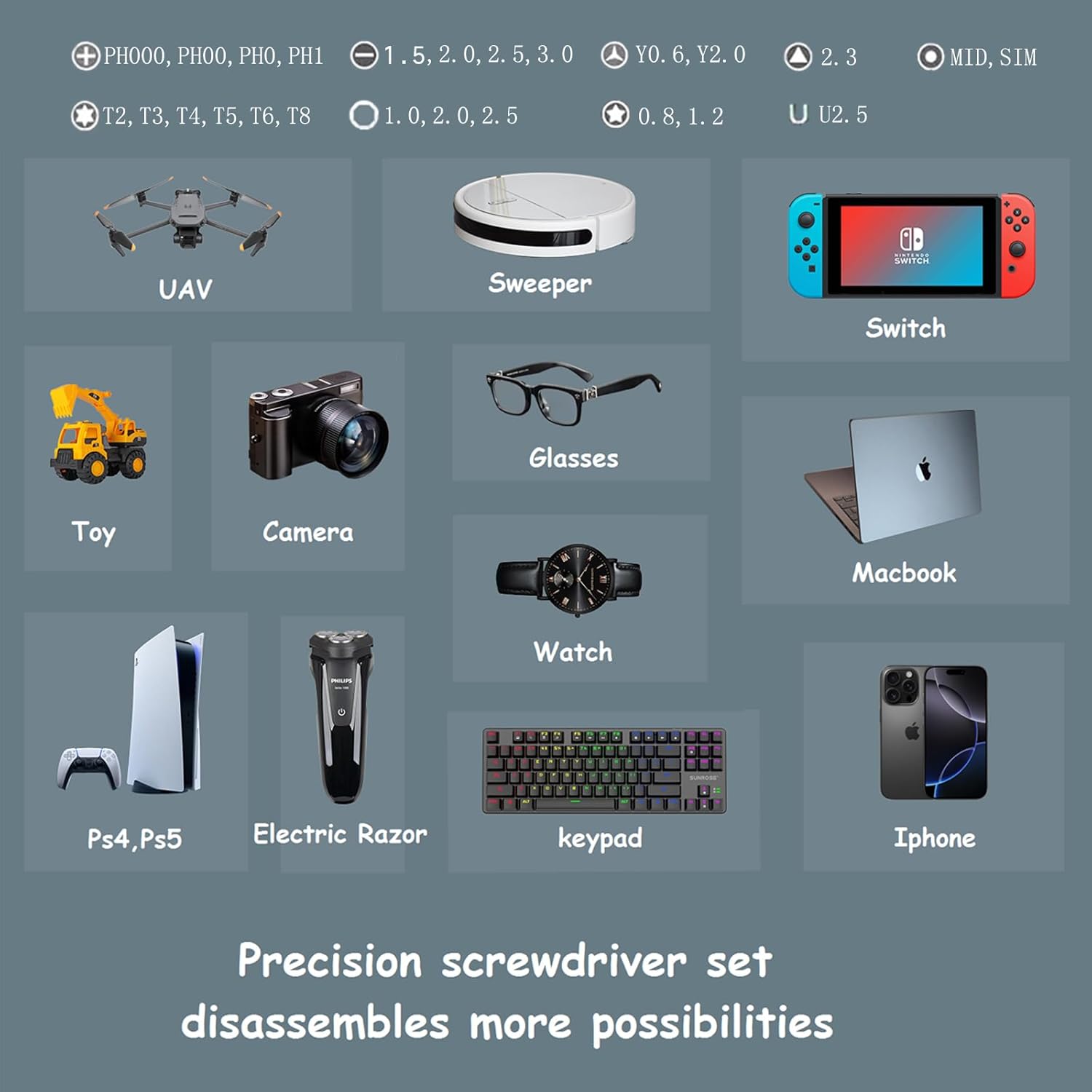 Versatility is where the 24-in-1 Precision Screwdriver Set truly shines. With its wide selection of double-headed bits, it’s suitable for a broad range of devices and applications, including: